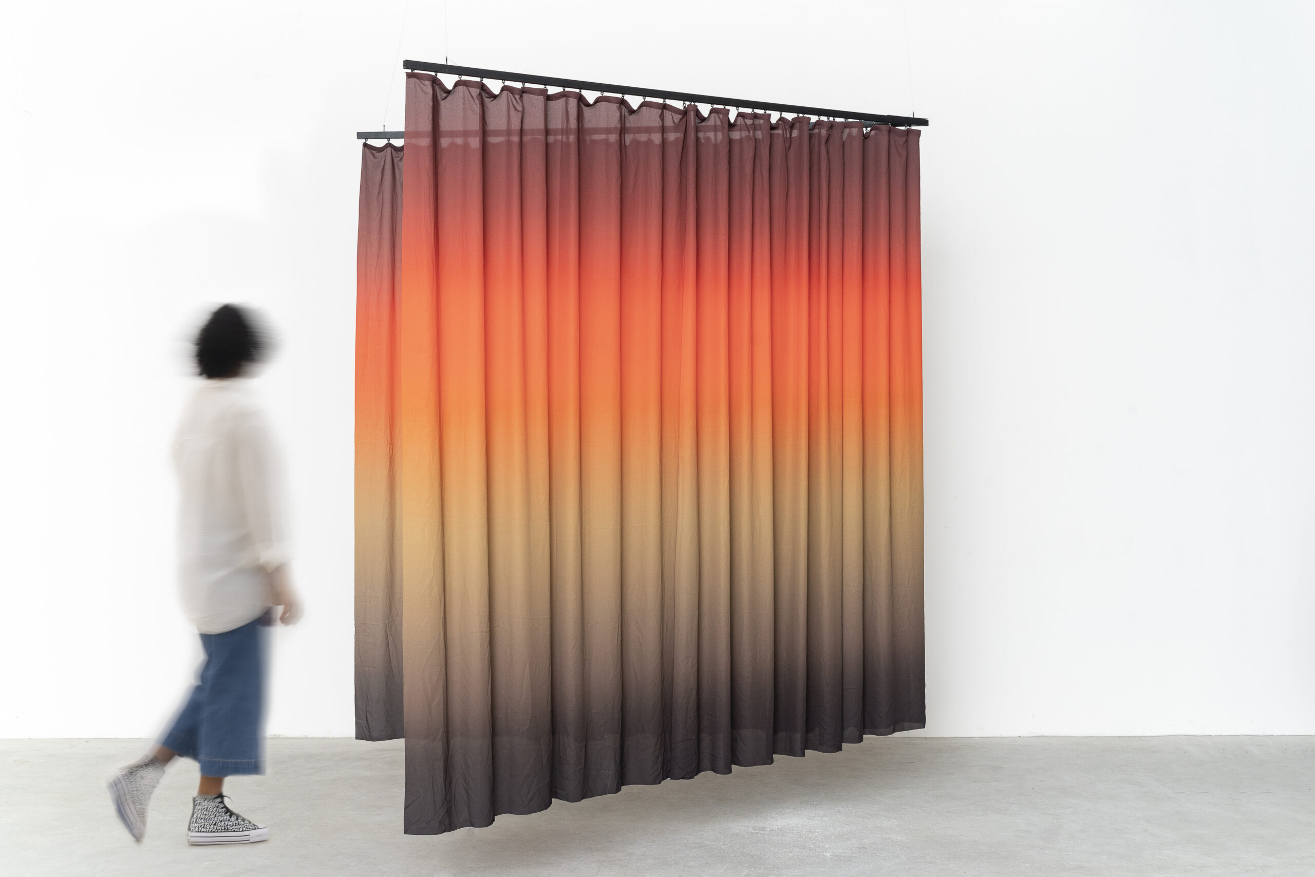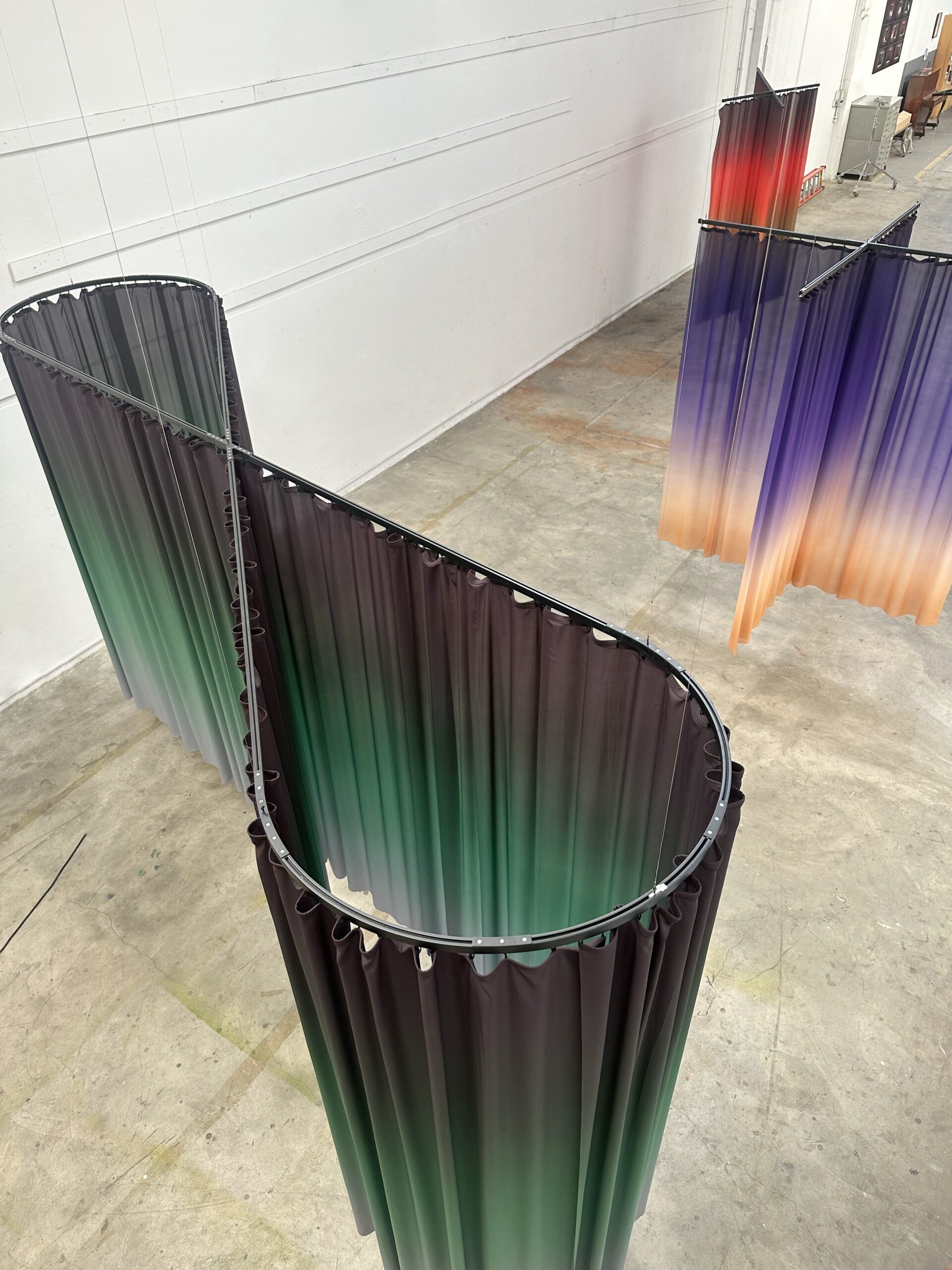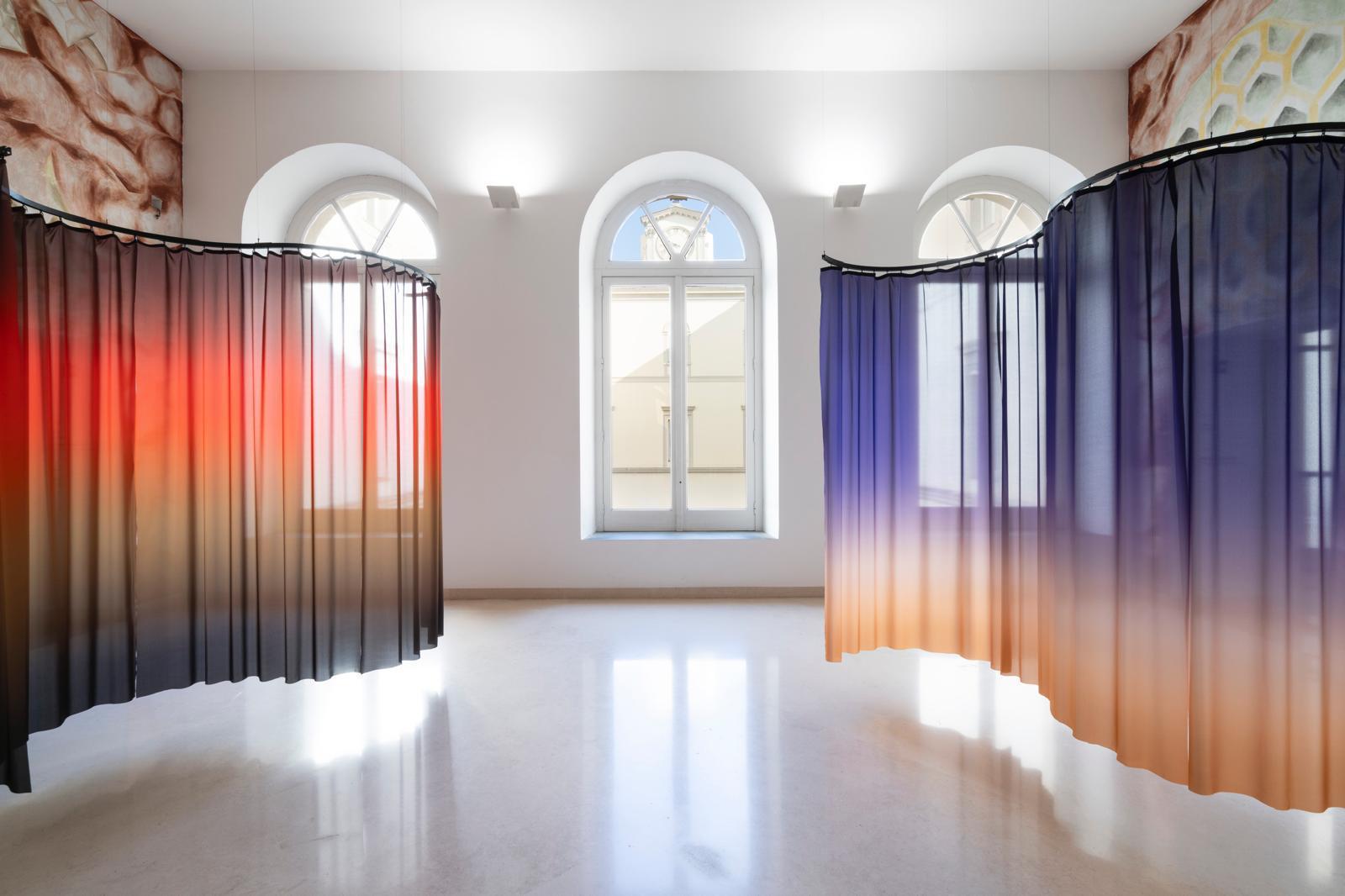 Departing from her previous large-scale architectural interventions, Koch here creates sculptural curtain-filters designed for intimate, intersubjective encounters. Suspended from tracks combining straight and curved segments, each piece functions like a three-dimensional diagram, evoking figures such as the cross, the infinity sign, or an intersection. Conceived as communication devices for two or more people, these works invite shared occupation and dialogue.