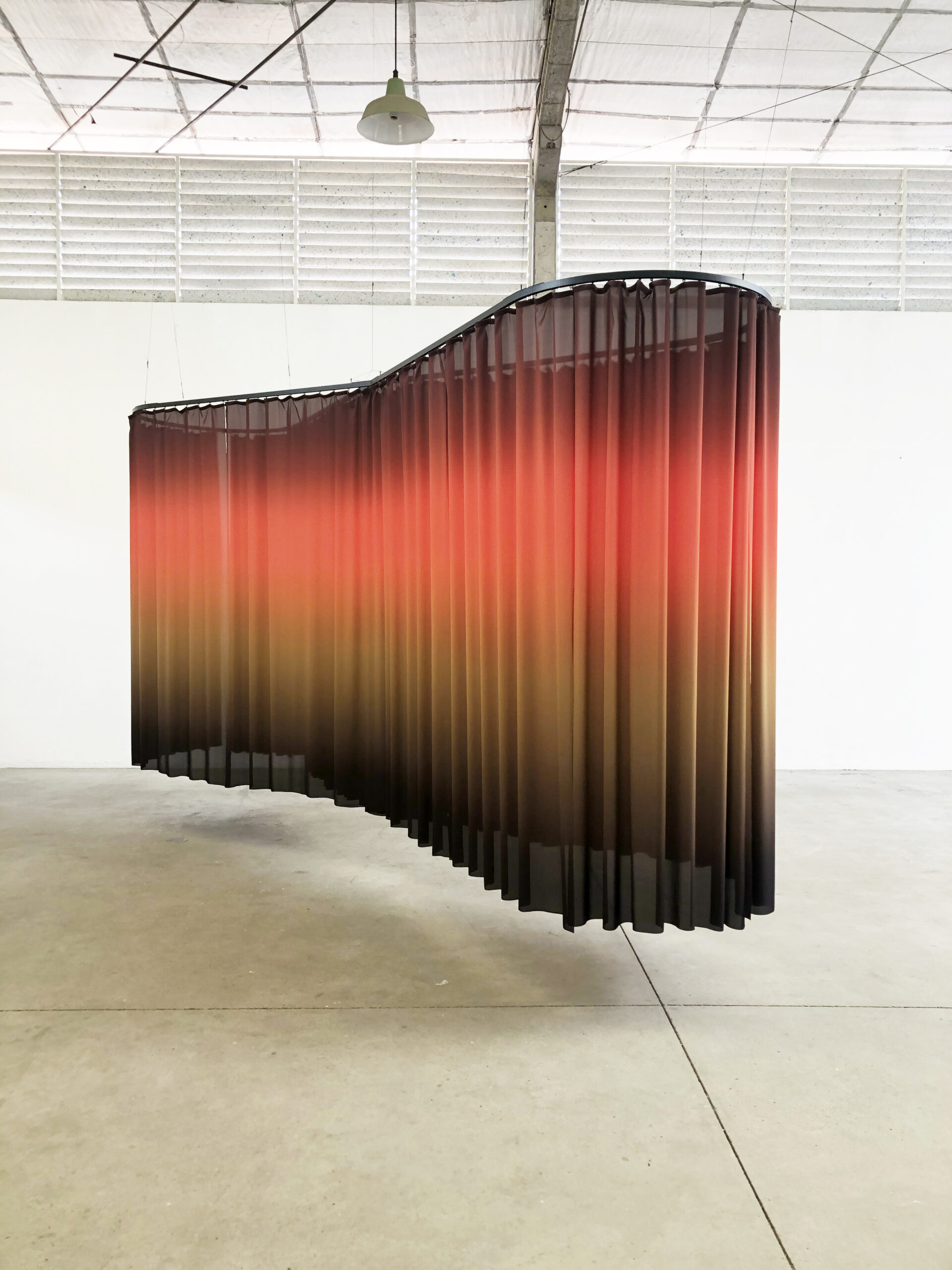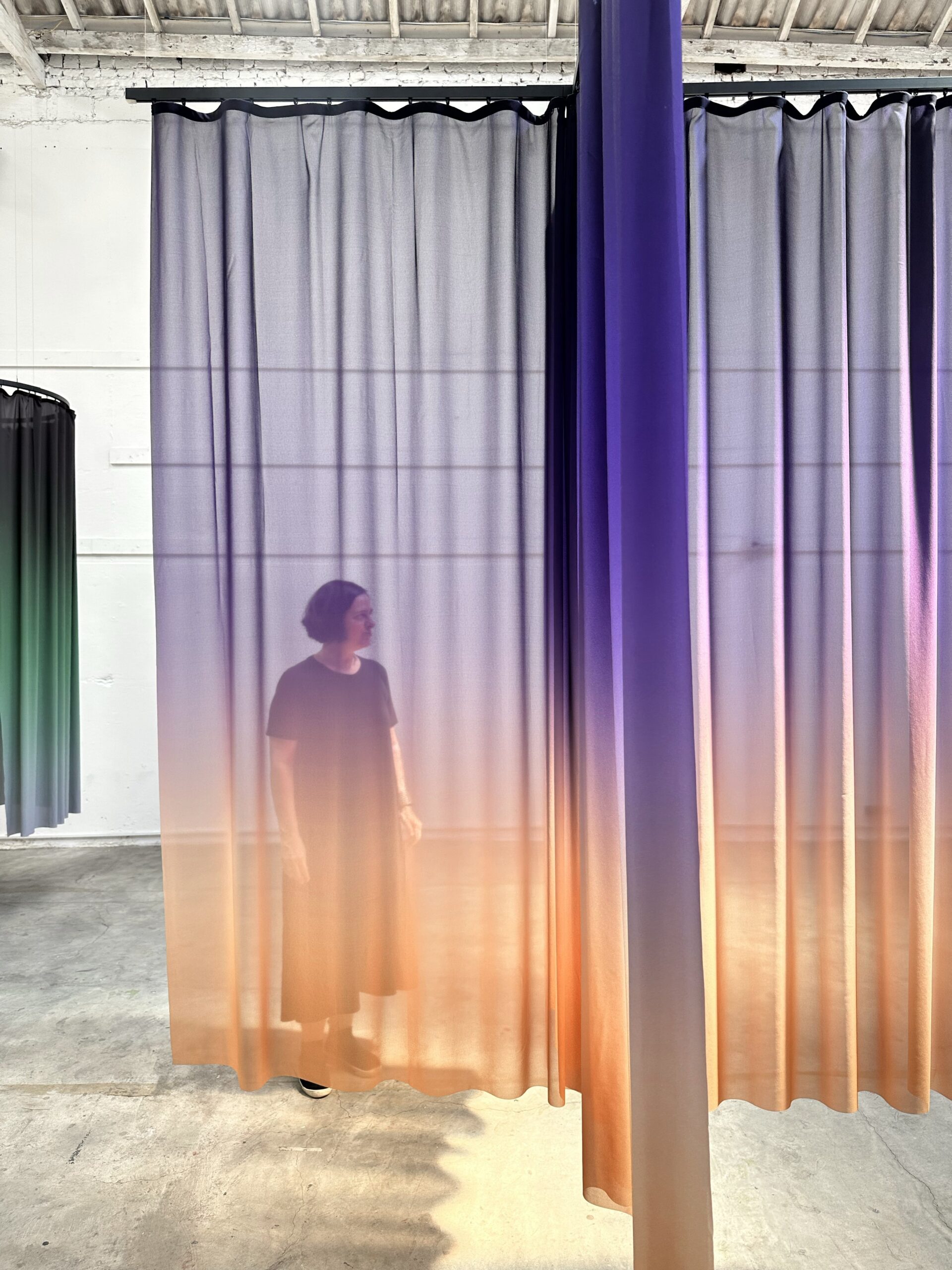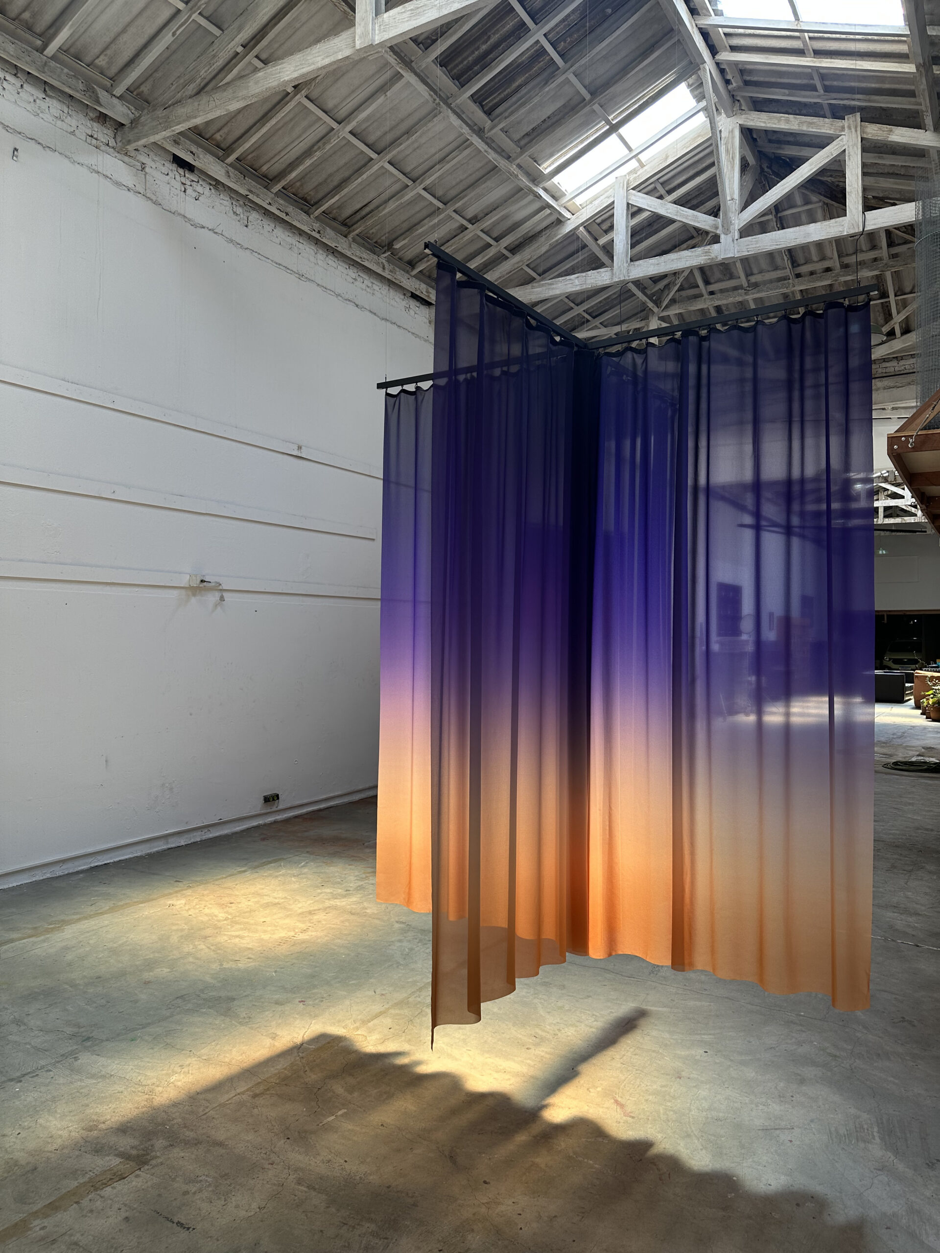Departing from her previous large-scale architectural interventions, Koch here creates sculptural curtain-filters designed for intimate, intersubjective encounters. Suspended from tracks combining straight and curved segments, each piece functions like a three-dimensional diagram, evoking figures such as the cross, the infinity sign, or an intersection. Conceived as communication devices for two or more people, these works invite shared occupation and dialogue.