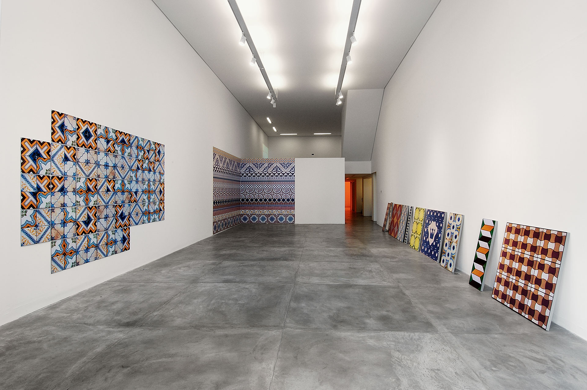 Conjunto de intervenções nas aberturas da galeria e trabalhos feitos a partir de imagens de azulejos, chamados “materiais concretos”, exercício de combinatória que geram conjuntos e variações.
