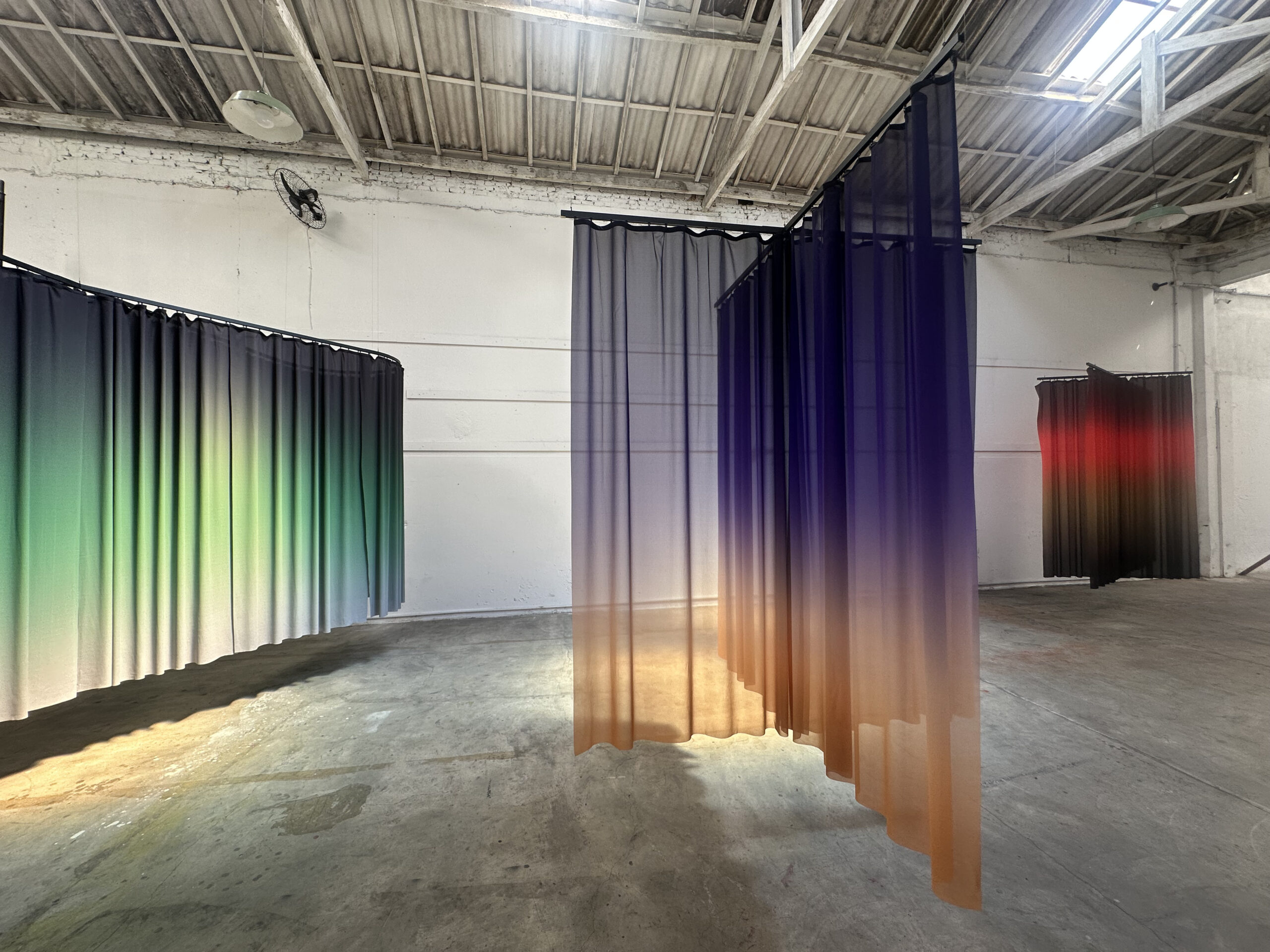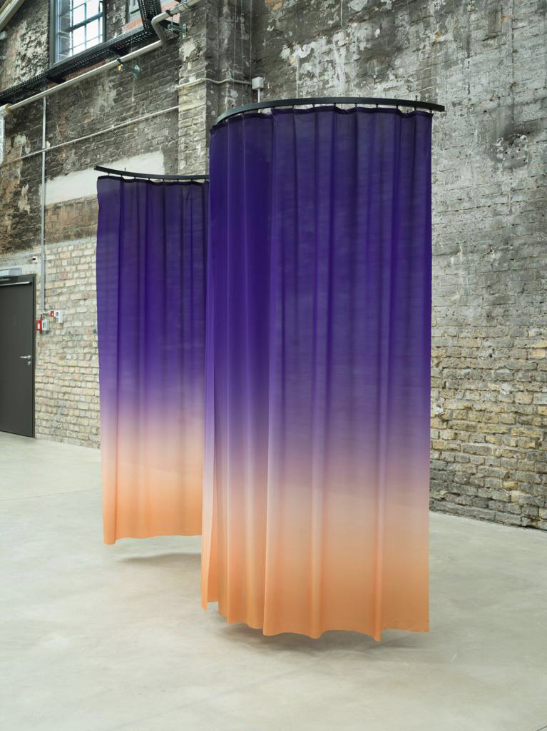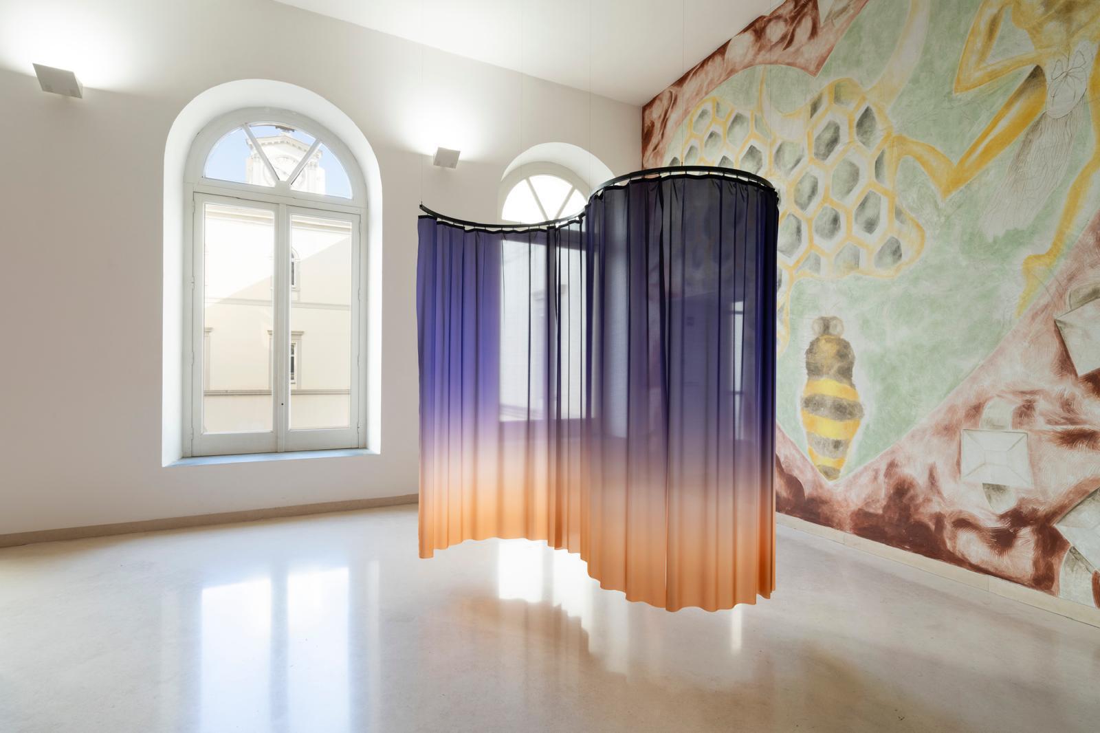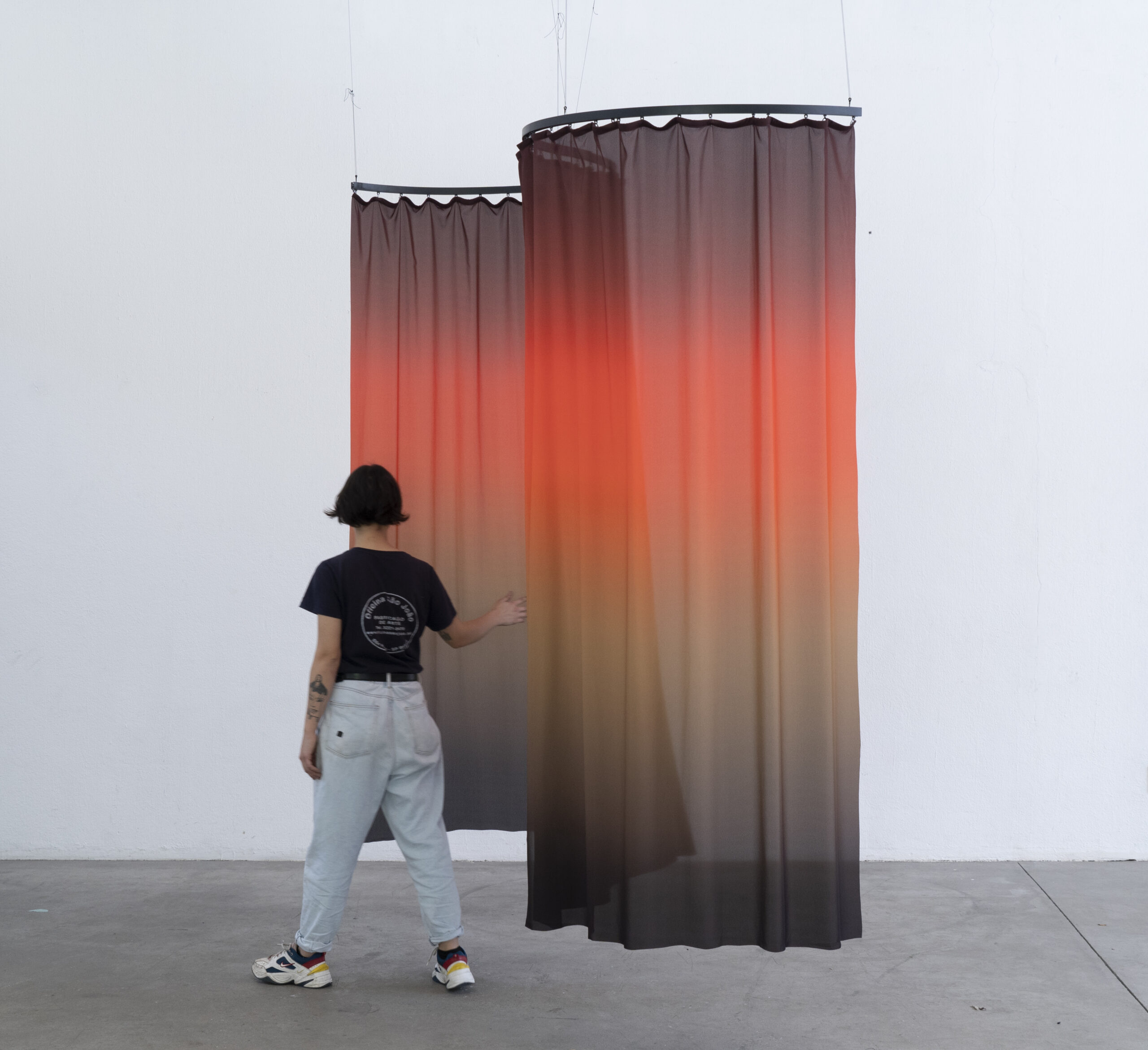 Novos sistemas (para relacionamentos) é um conjunto de três sistemas de móbiles em tecido translúcidos com gradientes impressos, que propõem zonas de conversa entre duas ou mais pessoas. Cada sistema é definido pela cor predominante do gradiente: rouge (vermelho), noturno (violeta) e verde. Em um exercício de combinatória, cada móbile é composto de trilhos retos e curvos e ganha tridimensionalidade com os tecidos suspensos. As diferentes formas que se repetem em cada sistema – conversadeira, cruz, cul-de-sac, cruz torta, trois e sans fin – sugerem variadas relações entre os sujeitos. Os móbiles se animam com as correntes de ar e são atravessados pela luz, intervindo nos modos de deslocamento dos corpos no espaço.
